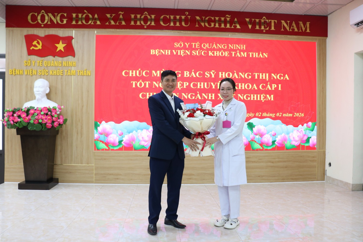 Bệnh viện Sức khỏe Tâm thần chúc mừng bác sĩ Hoàng Thị Nga đã hoàn thành chương trình đào tạo và tốt nghiệp Bác sĩ Chuyên khoa cấp I, chuyên ngành Xét nghiệm y học.