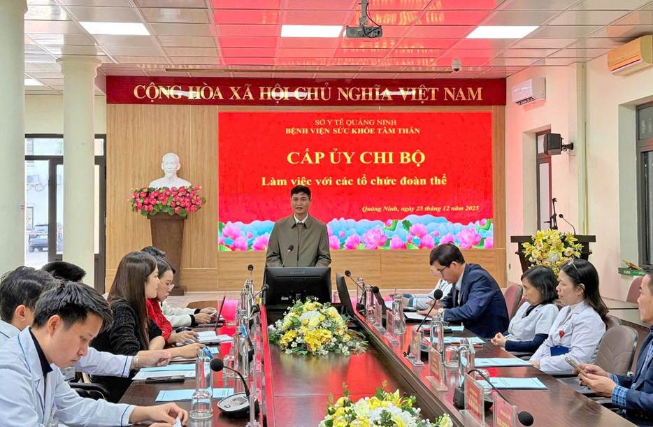 Chiều ngày 25/12/2025, Cấp ủy Chi bộ Bệnh viện Bảo vệ sức khỏe Tâm thần Quảng Ninh đã có buổi làm việc với các tổ chức đoàn thể trong đơn vị nhằm đánh giá kết quả hoạt động năm 2025 và định hướng phương hướng, nhiệm vụ năm 2026.