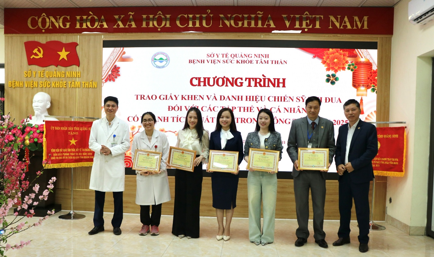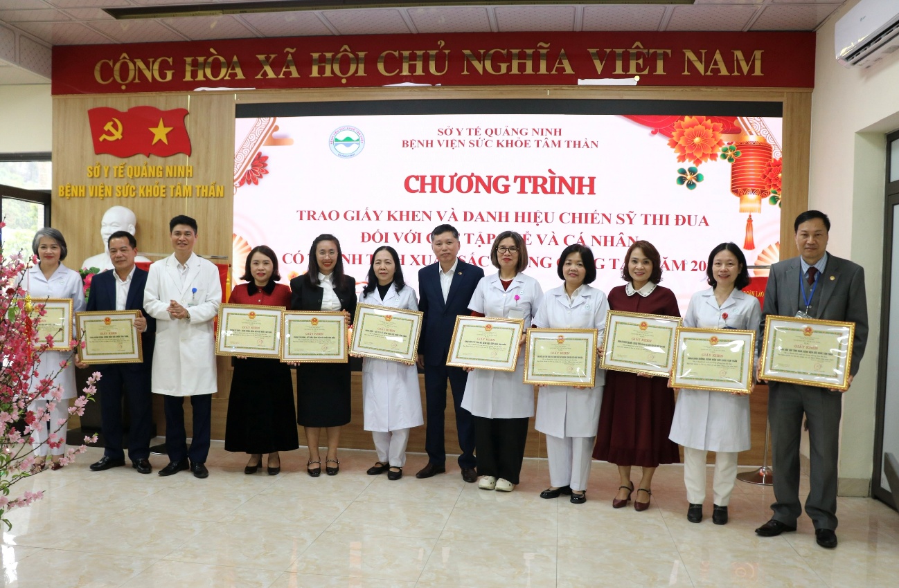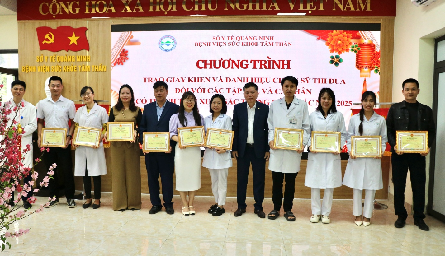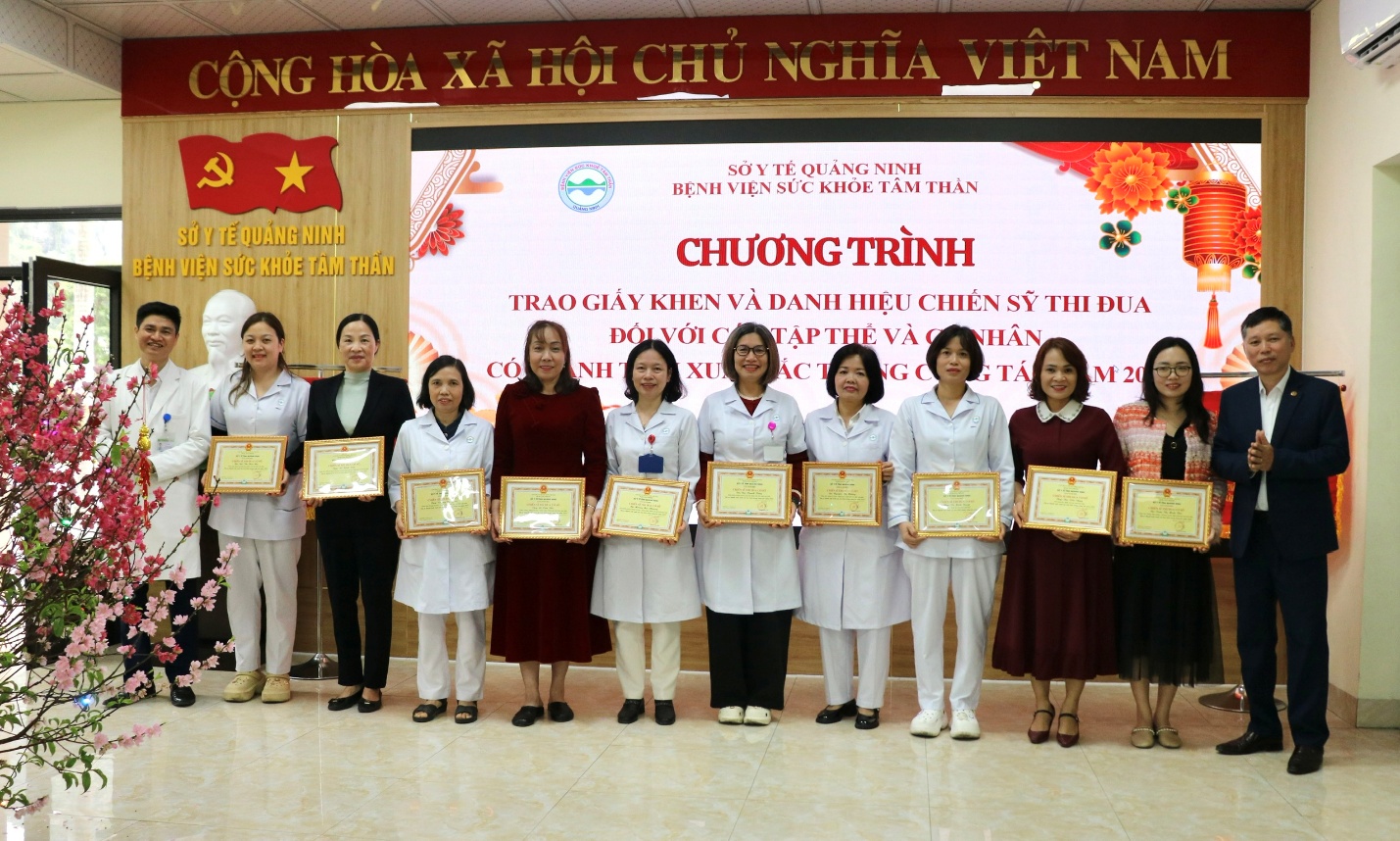 Theo Quyết định số 2936/QĐ-SYT ngày 19/12/2025 của Sở Y tế Quảng Ninh về việc tặng Giấy khen cho các tập thể, cá nhân có thành tích xuất sắc trong phong trào thi đua thực hiện nhiệm vụ bảo vệ, chăm sóc và nâng cao sức khỏe Nhân dân năm 2025, Bệnh viện Sức khỏe tâm thần Quảng Ninh có 11 tập thể và 34 cá nhân vinh dự được nhận Giấy khen.