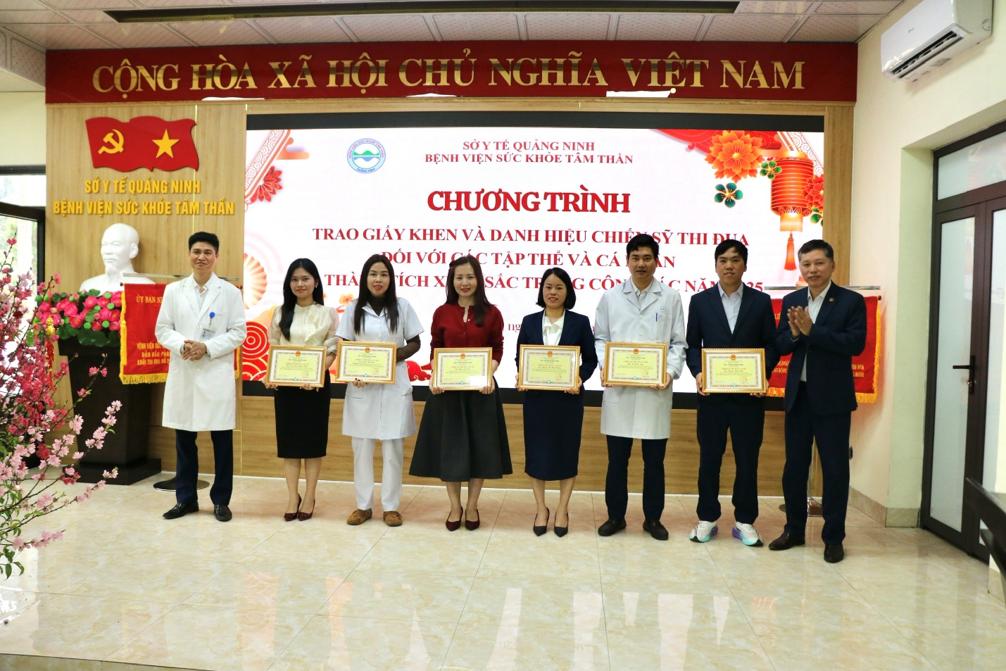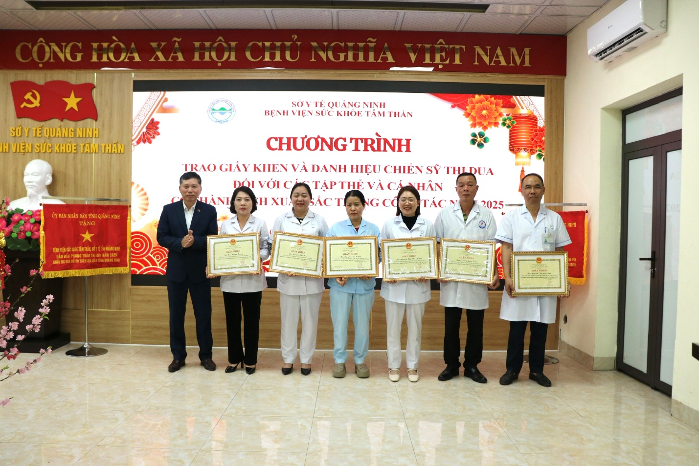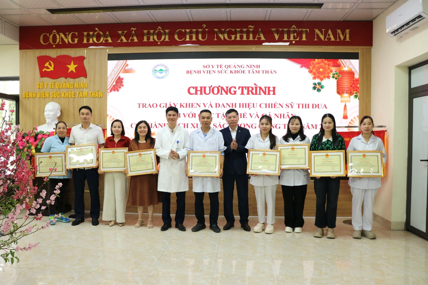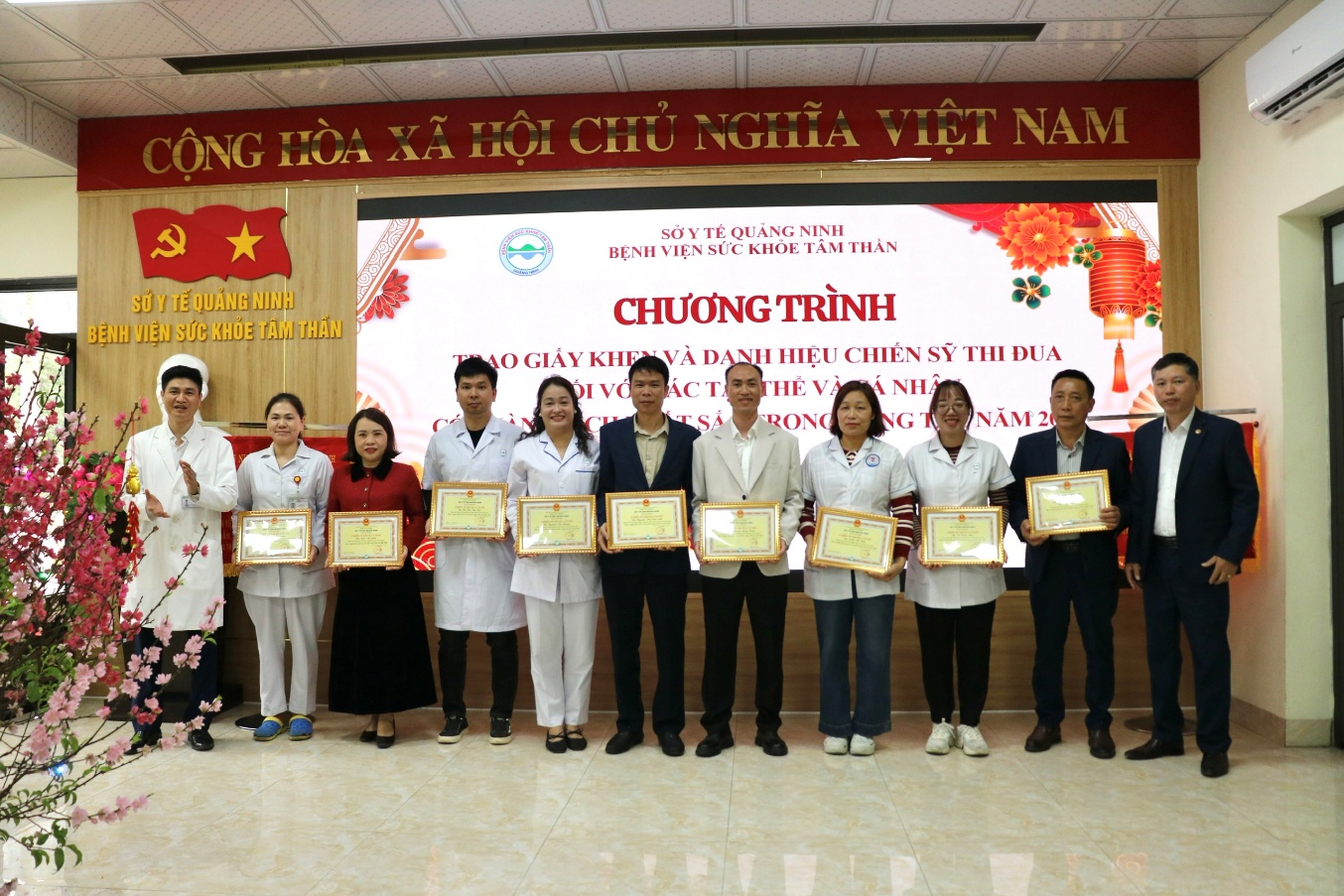 Theo Quyết định số 2936/QĐ-SYT ngày 19/12/2025 của Sở Y tế Quảng Ninh về việc tặng Giấy khen cho các tập thể, cá nhân có thành tích xuất sắc trong phong trào thi đua thực hiện nhiệm vụ bảo vệ, chăm sóc và nâng cao sức khỏe Nhân dân năm 2025, Bệnh viện Sức khỏe tâm thần Quảng Ninh có 11 tập thể và 34 cá nhân vinh dự được nhận Giấy khen.