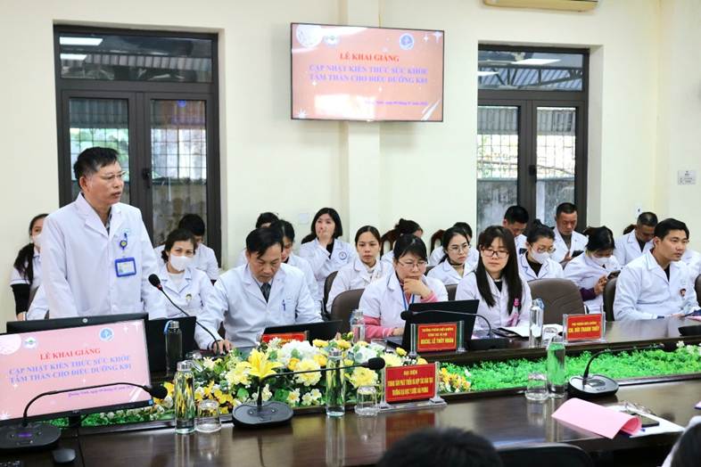 🎤 Phát biểu tại Lễ khai giảng, BS.CKI Nguyễn Văn Lũy nhấn mạnh vai trò đặc biệt quan trọng của người điều dưỡng tâm thần trong công tác chăm sóc toàn diện người bệnh, từ theo dõi triệu chứng, thực hiện y lệnh, hỗ trợ tâm lý, giáo dục sức khỏe đến phục hồi chức năng và tái hòa nhập cộng đồng. Đồng chí kỳ vọng khóa học sẽ giúp đội ngũ điều dưỡng cập nhật kiến thức nền tảng và chuyên sâu, đáp ứng yêu cầu ngày càng cao của công tác chăm sóc sức khỏe tâm thần trong giai đoạn hiện nay.